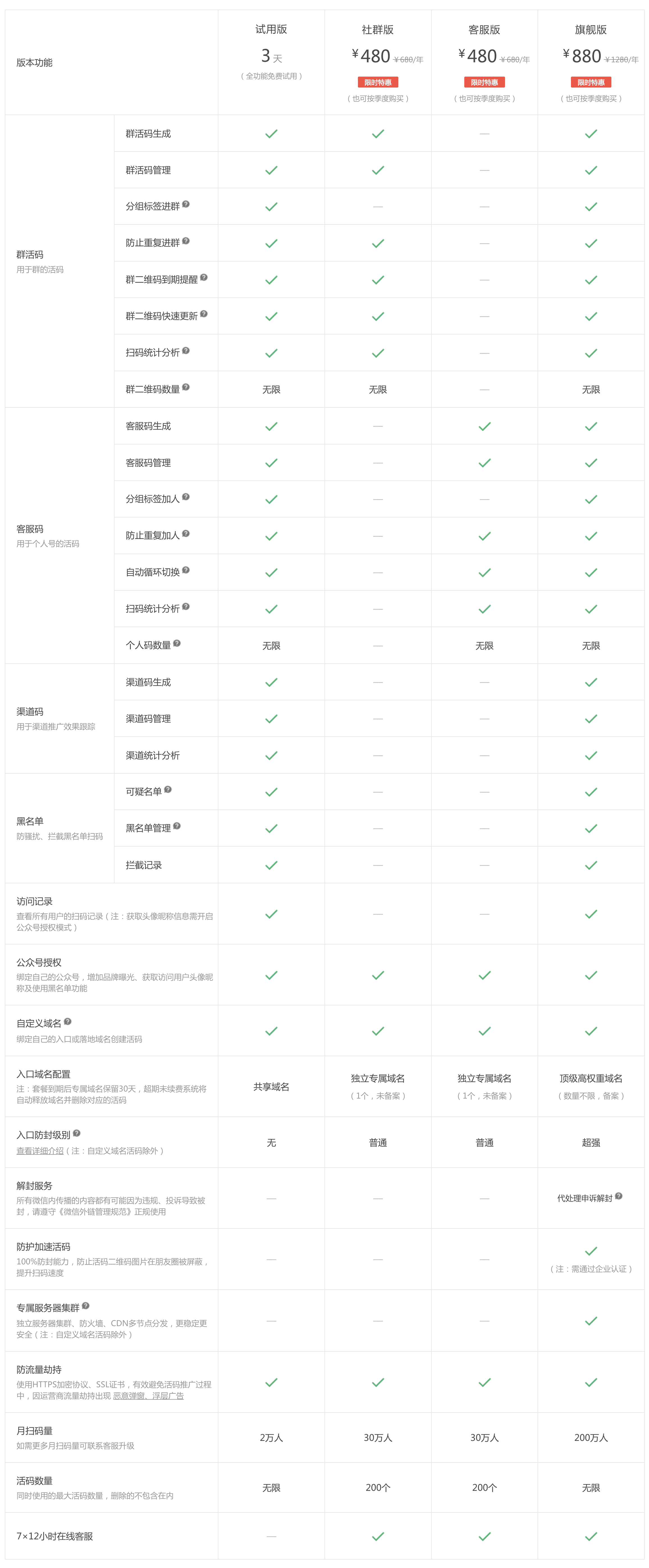 活码数量 同时使用的最大活码数量,删除的不包含在内 | 无限 | 200个 | 200个 | 无限 | |