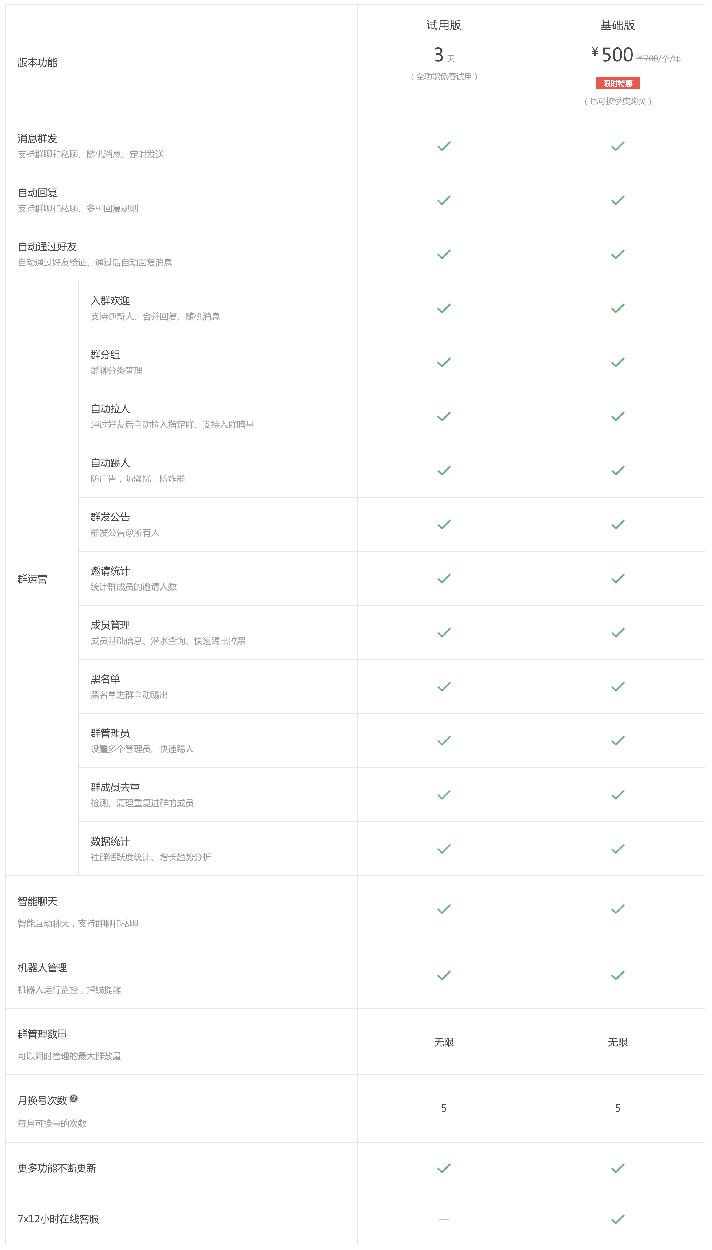 群管理数量 可以同时管理的最大群数量 | 无限 | 无限 | |